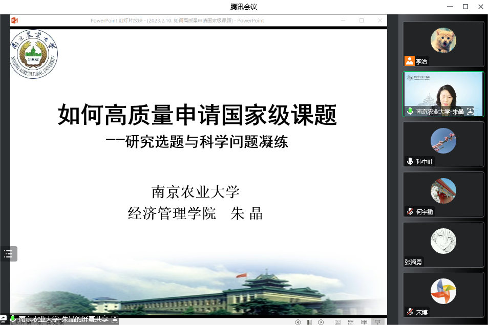 邀请,著名农业经济学者、南京农业大学首席教授朱晶做了题为《如何高质量申请国家级课题——研究选题与科学问题凝练》的学术报告。报告由院长孙中叶教授主持,70余名师生在线聆听了报告。