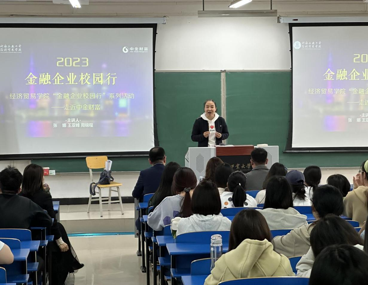 韦兵从大学生职业发展规划出发,讲述了自己从2007年毕业后,从客户经理到市场部经理,到总经理助理,再到现任河南管理总部执行负责人的一路职业发展历程。同时,他还对学生寄语愿景,希望学生能树立正确的价值观,认真选择自己的实习单位,为以后的就业做好充足的准备。中金财富证券河南分公司的产品顾问周锦城以“理财的正确打开方式”为主题,从中金公司的麻豆tv出发,讲述了投资与赌博的区别,以及大类资产配置在不同年份的表现,为同学们建立“投资需要择时”,“耐心长期持有”的投资理念。