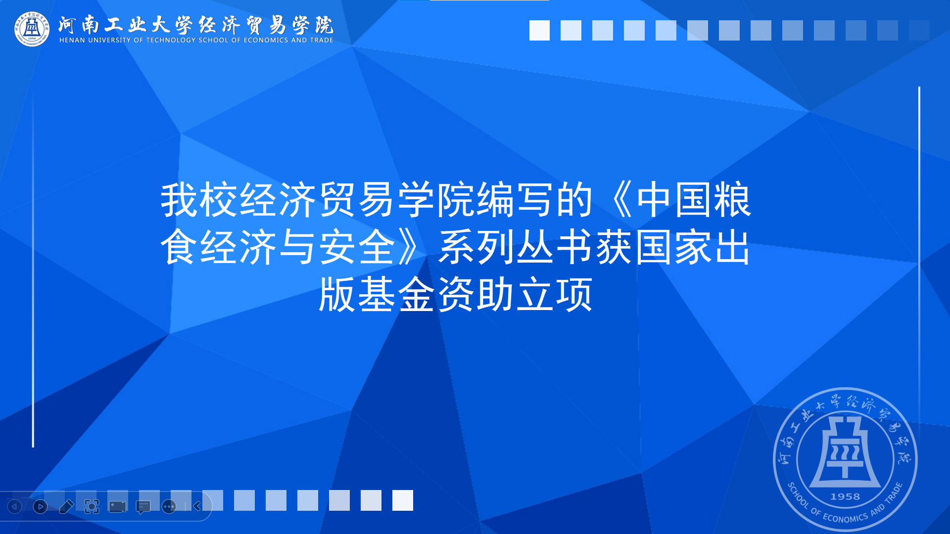 编写的《中国粮食经济与安全》系列丛书获得资助。这是我校首次获批国家出版基金立项资助,标志着我校在粮食经济研究领域再上新台阶、取得新突破。