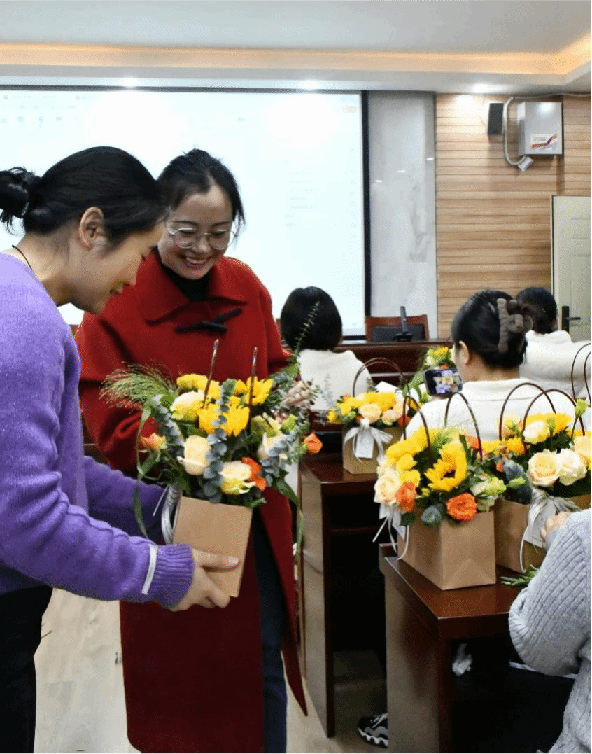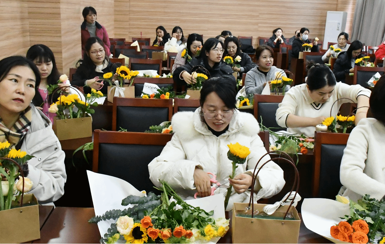 插花师为女教职工们讲述了插花的原则、流程以及技巧,并启发大家发挥想象力和创造力,创作出有个性的作品。现场的女教师们纷纷拿起剪刀,选择自己喜欢的花,自行设计并进行创意插花。经过不断尝试和实践,一盆盆生机盎然、创意十足的插花作品呈现在大家眼前,令人赏心悦目。老师们纷纷拍照、发朋友圈,激动不已。