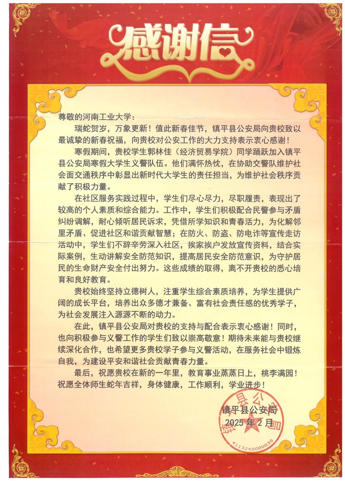 2023级经济学专业学生郭林佳加入镇平县公安局寒假大学生义务警队,协助指挥交通、维护交通秩序的赞扬,也对学校育人成果表示感谢,祝愿学校教育事业蓬勃发展。