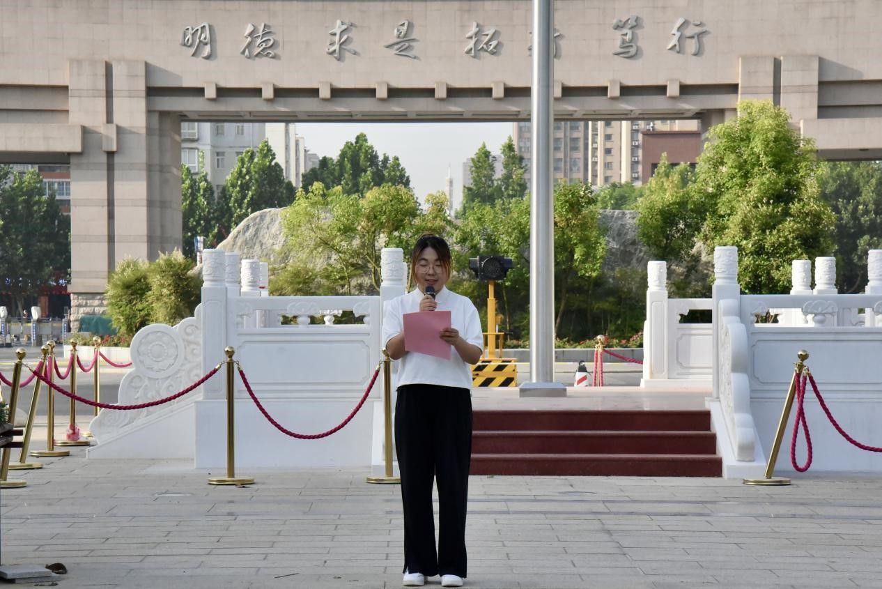 上午7时整,升旗仪式正式拉开帷幕,国旗护卫队步伐铿锵,护送国旗入场。在激昂的国歌声中,五星红旗冉冉升起,全体师生庄严肃立,齐唱国歌,向国旗行注目礼。升旗礼毕,经济2302班李宗艺作为学生代表发言。她从勤学铸剑、担当立心、传承文化三个方面,号召同学们将专业学习与报国志向结合,在日常行动中践行爱国担当,主动传承并创新中华优秀传统文化,最后呼吁全体同学以青春之力,在民族复兴征程中书写时代荣光。