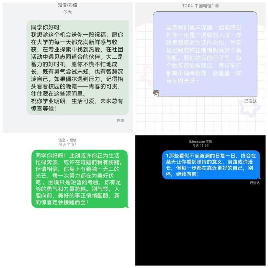 祝福传递,温暖满漾。“陌生人的祝福”活动温情满溢,活动期间,负责人将自愿报名同学随机匿名配对,参与者向“神秘伙伴”发祝福短信,传递善意关怀,打破陌生隔阂。该活动为同学搭建表达与接收鼓励平台,架起心灵沟通桥梁,让大家体验给予快乐与收获感动,增强校园联系感与归属感,在传递正能量中助力学生培养乐观心态,促进心理健康。