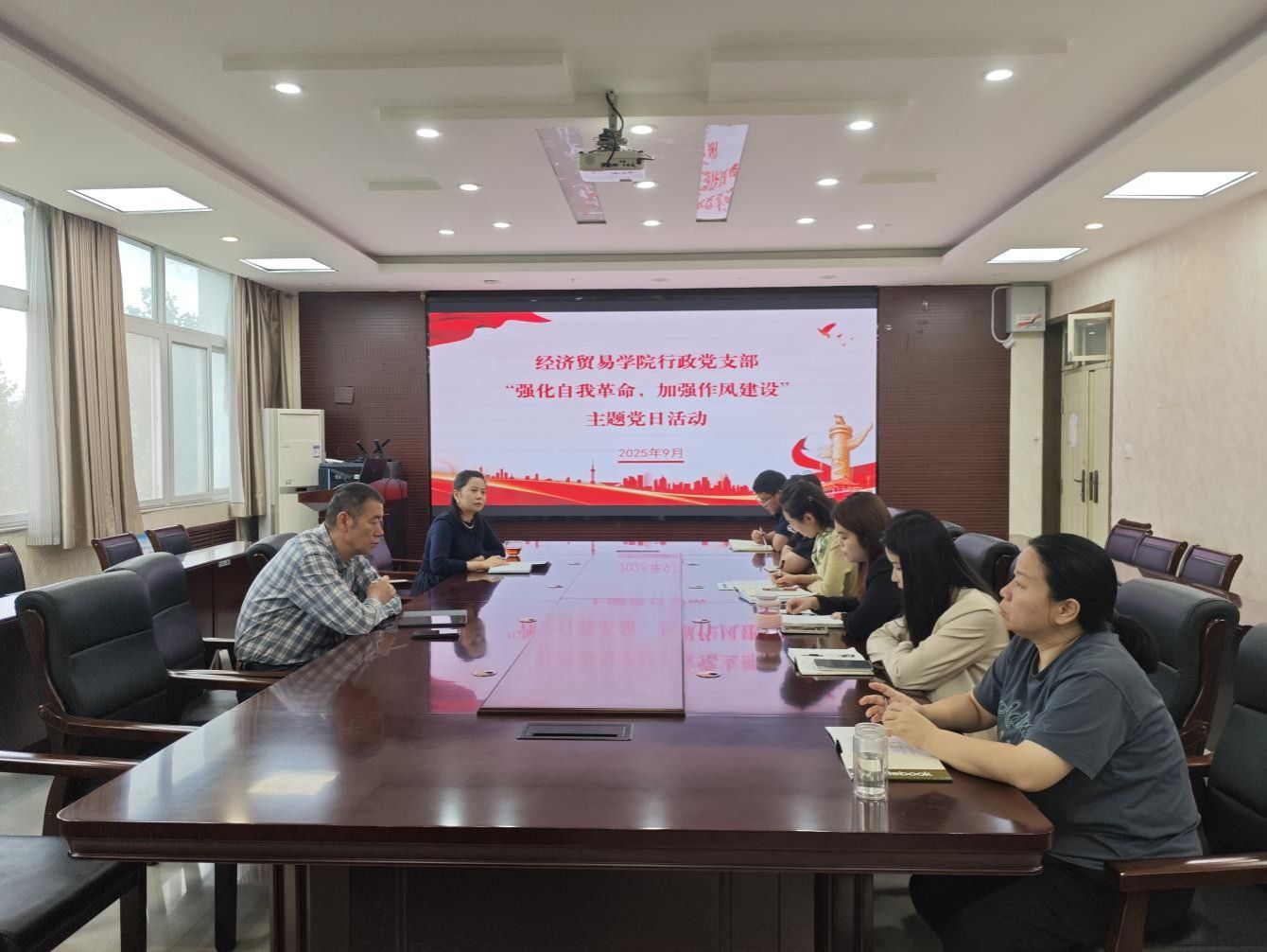 行政党支部在博识楼3501会议室组织召开了以“强化自我革命,加强作风建设”为主题的党日活动。支部全体党员参加活动,活动由支部书记岳鹏珍主持。