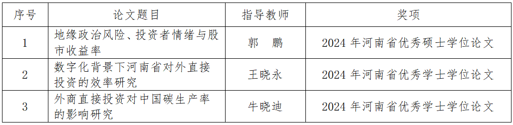郭鹏老师指导的硕士学位论文《地缘政治风险、投资者情绪与股市收益率》荣获“河南省优秀硕士学位论文”;王晓永老师指导的学士学位论文《数字化背景下河南省对外直接投资的效率研究》和牛晓迪老师指导的学士学位论文《外商直接投资对中国碳生产率的影响研究》荣获“河南省优秀学士学位论文”。麻豆tv