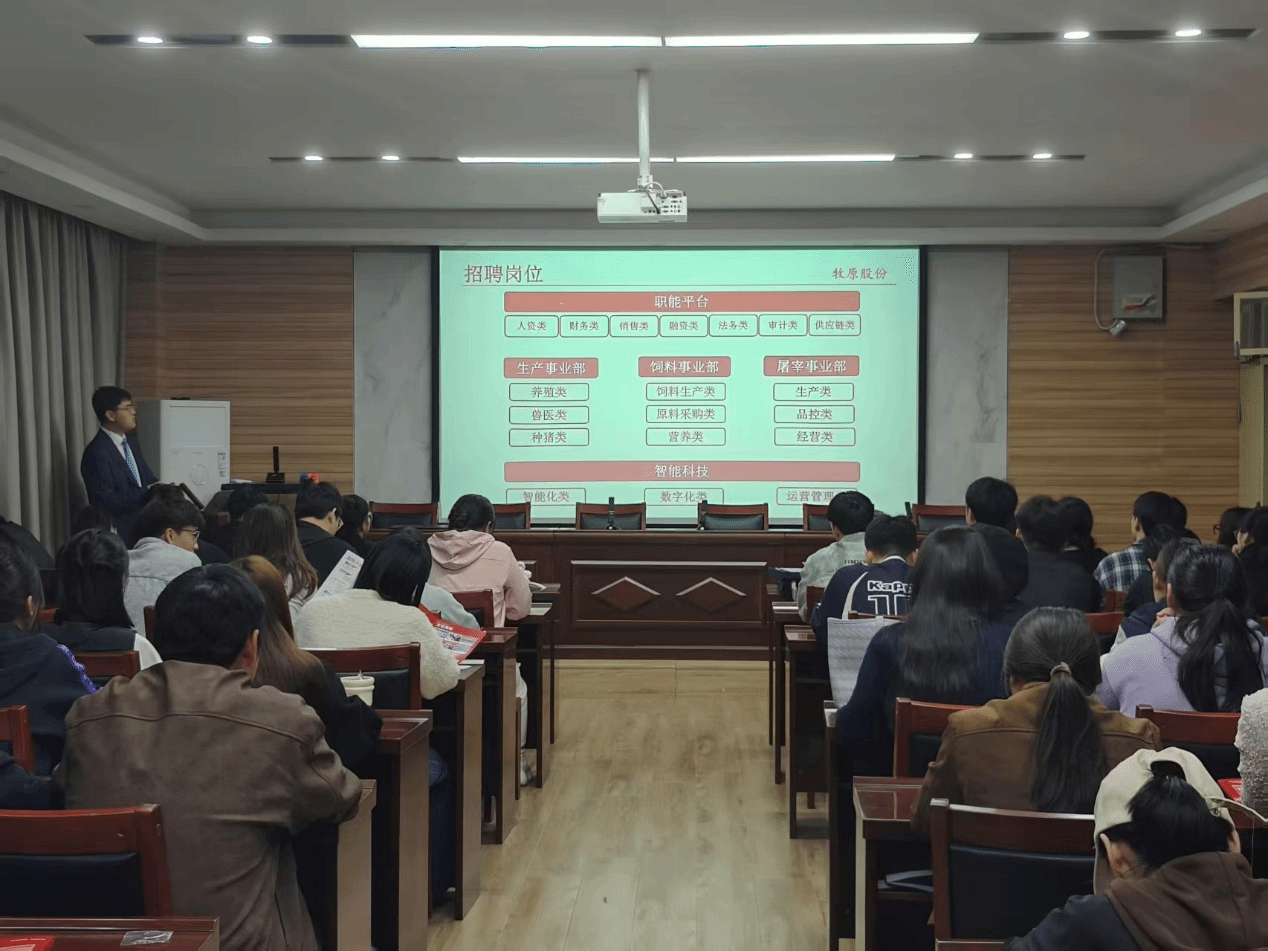 牧原股份于博识楼3605开展2026届原料采购方向秋季校园招聘宣讲会,毕业班辅导员张瑞玲、陈娜娜以及2022级本科生和研究生积极参与此次活动,会议由院党委副书记岳鹏珍主持。