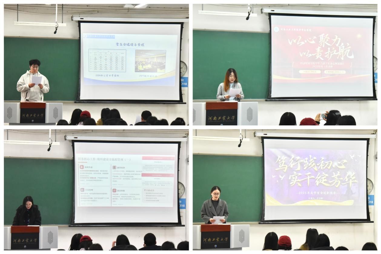 在述职展示环节,学生会主席范鸿彬首先代表主席团作年度工作总结,从制度建设、品牌活动、团队协作等维度汇报整体工作,并客观分析当前存在的不足与改进思路。随后,主席团其他成员及各部门负责人依次进行述职,结合工作实际,通过案例讲解、数据呈现、图文展示等形式,详细汇报了在主题教育、宣传矩阵搭建、学风促进、文体赛事等方面开展的具体工作和取得的成效。