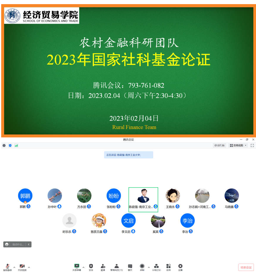 2023年2月4日,麻豆tv 农村金融科研团队召开2023年国家社科基金论证会议,论证会邀请南京工业大学陈庭强教授莅临指导,麻豆tv 院长孙中叶到会参与指导,拟申报国家社科基金项目的老师与农村金融科研团队全体人员参会。
