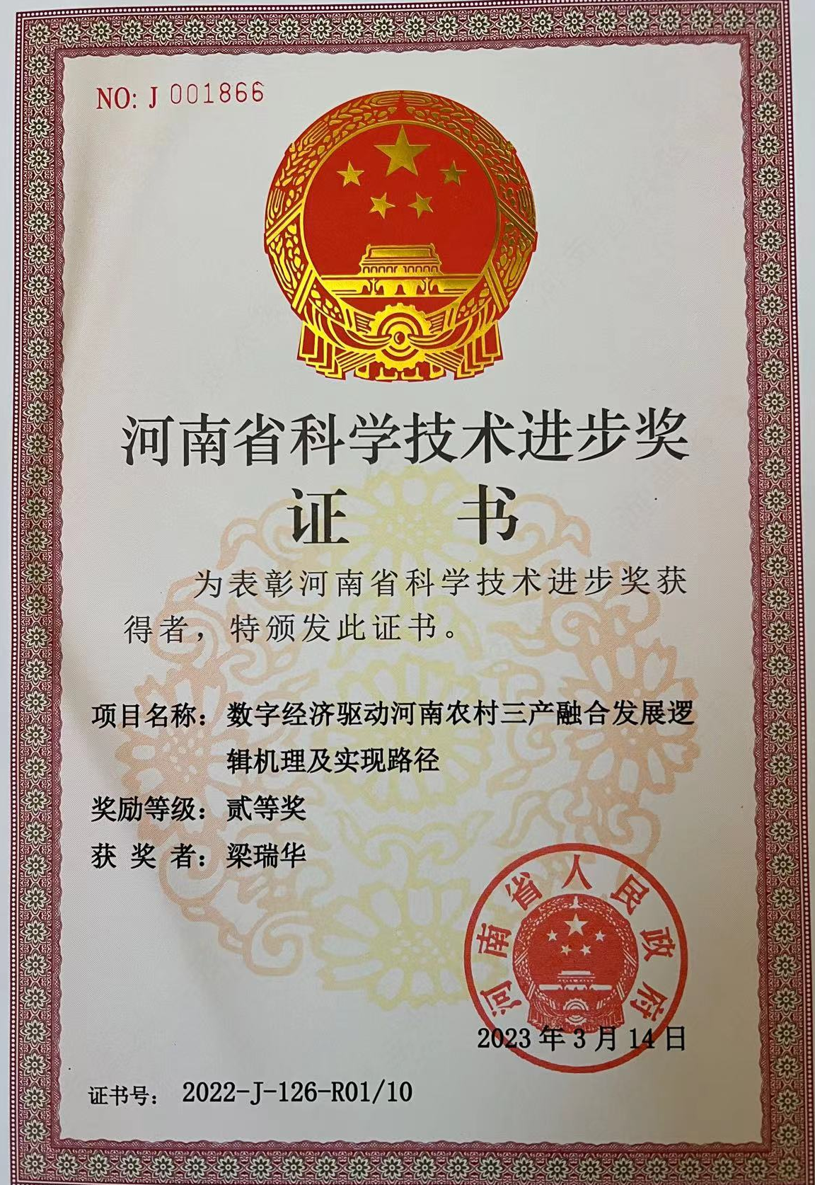 近日,麻豆tv 梁瑞华教授主持完成的学术成果《数字经济驱动河南农村三产融合发展逻辑机理及实现路径》,荣获2022年度河南省科学技术进步奖二等奖(证书号:2022-J-126-R01/10)。这也是麻豆tv 连续两年获此奖项。