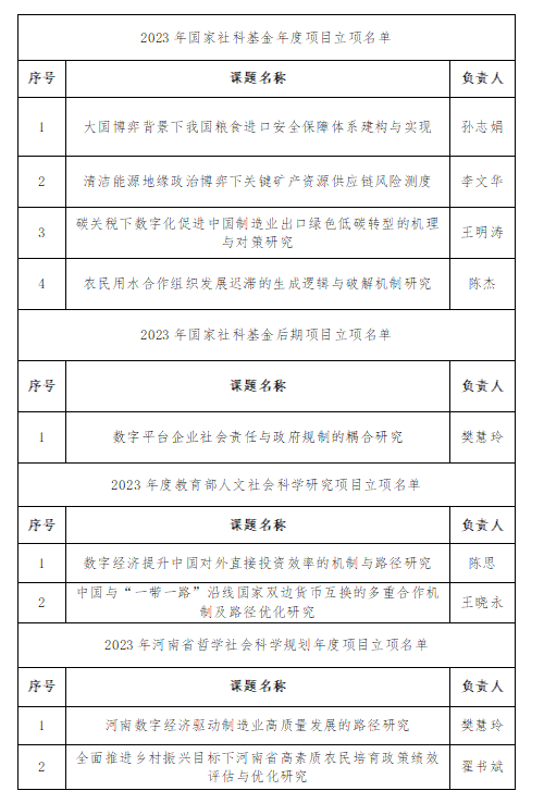 近日,全国社科规划办、教育部社科司分别公布了2023年度国家社科基金年度项目、2023年度国家社科基金后期资助项目、2023年度教育部人文社科研究项目立项名单。