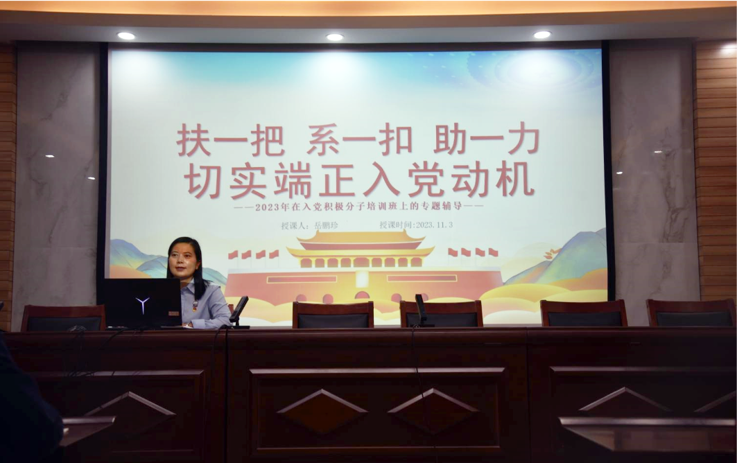 岳鹏珍以“扶一把,系一扣,助一力,切实端正入党动机”为主题,从重视积极分子培养意义、重视入党条件的满足、保持入党积极分子培训效果三个方面强调思想上完全入党的重要性。并希望同学们无论能否入党,都要和党的性质和宗旨融为一体,冲锋在前,为他人服务,实现人生价值。