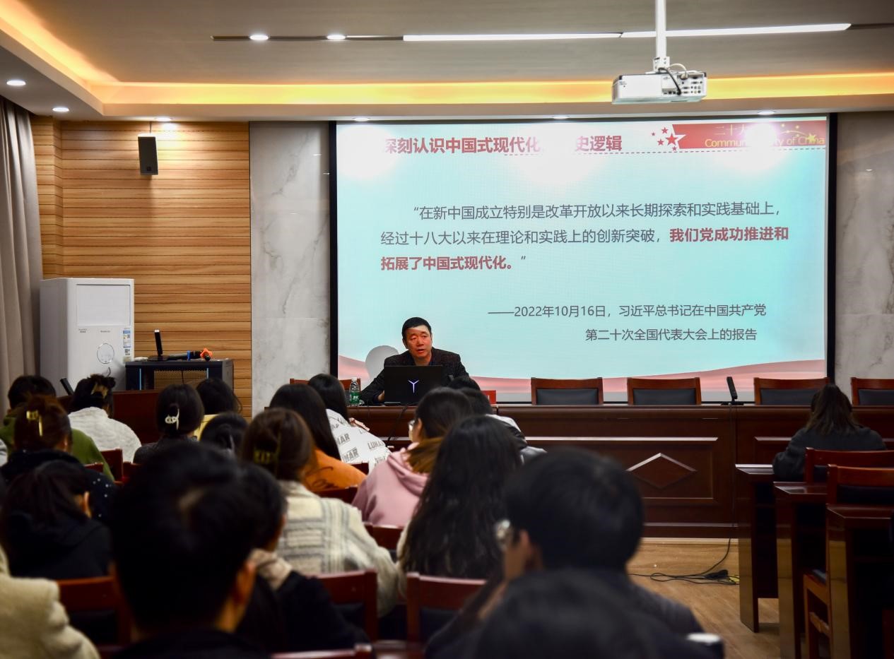 会上,李刚以“以中国式现代化全面推进中华民族伟大复兴——深入学习贯彻党的二十大精神”为主题,从中国式现代化的历史逻辑、中国特色、本质要求、重大原则等四个方面为学员们作了详细讲解,带领学员们系统深入地学习了党的二十大精神。课程最后,李刚对学员们提出了四点要求,希望同学们要把个人的理想抱负与民族复兴有机结合、把自我奋斗与团队精神有机结合、将登高望远与脚踏实地有机结合、将勤奋工作与勤于学习有机结合,确保不断进步,绽放青春之花。
