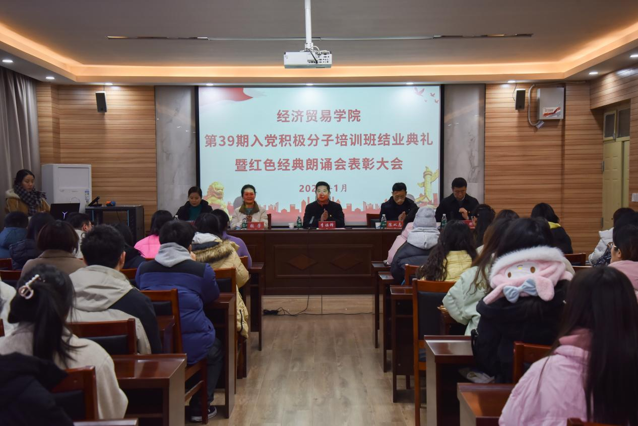 分党校在3605会议室召开2023年第三十九期入党积极分子培训班结业典礼暨红色经典朗诵会表彰大会。副校长李焕锋、校党委组织员第二组组长、正处级组织员陈从志、院分党校校长、党委书记李刚、校党委组织部副部长张芳,以及全体辅导员和第三十九期入党积极分子参加仪式。典礼由经济贸易分党校副校长、院党委副书记岳鹏珍主持。