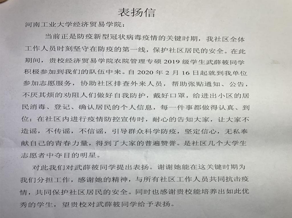 在服务期间,武薛筱积极工作,尽心尽力为社区居民服务。她把守社区大门排查外来人员,给进出社区的居民进行消毒、登记、确认个人信息等工作,帮助工作人员张贴通知、公告,并不厌其烦地奉劝居民做好自我防护,戴好口罩。在社区内进行疫情防控宣传时,她像演讲一样认真为居民讲解专业知识,引导群众科学防疫,让大家不造谣,不传谣,不信谣,坚定(抗击疫情的)信心。无私奉献自己青春力量的武薛筱,每一件事都做得认真、到位,赢得了大家的普遍赞誉。