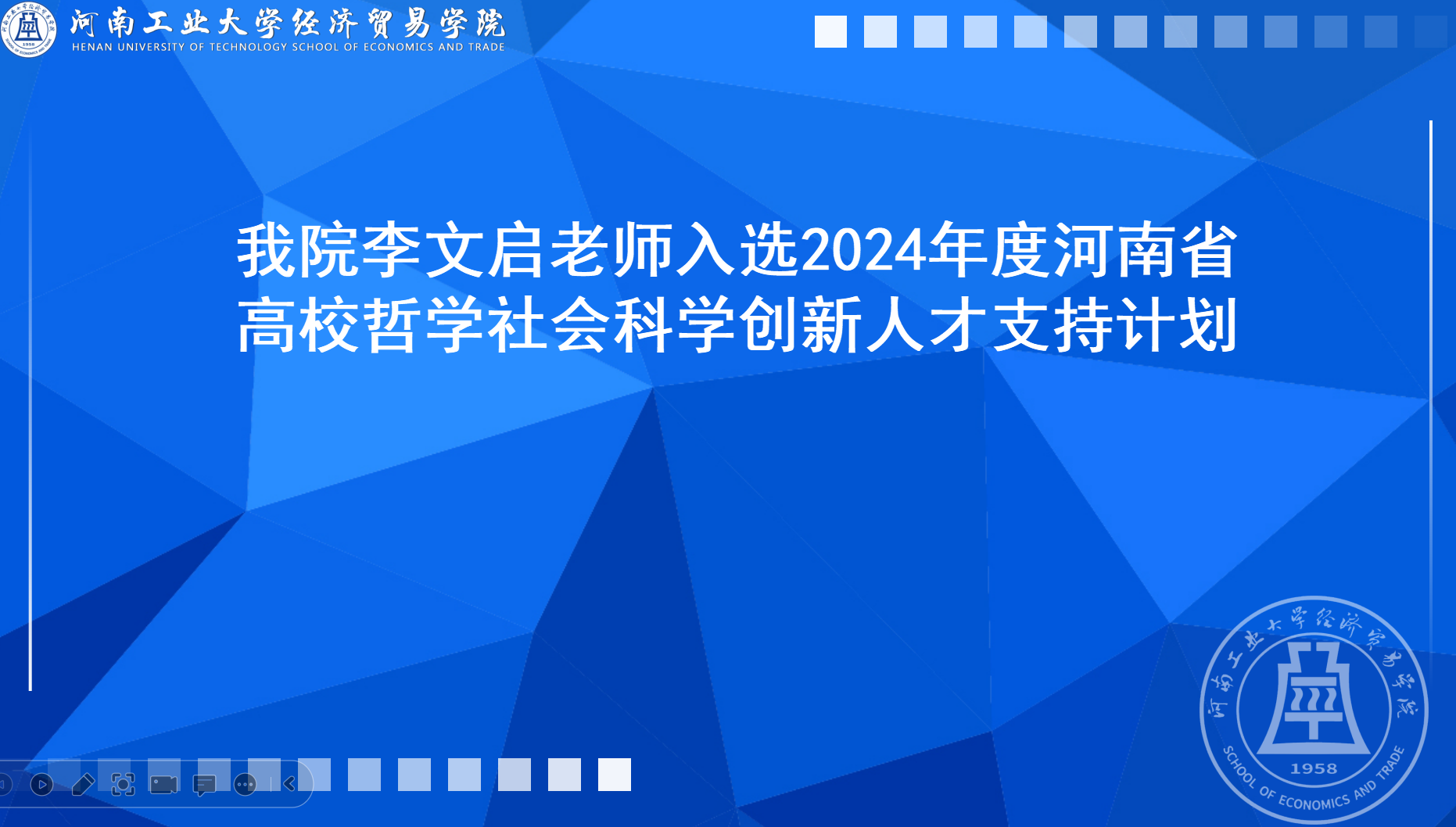 李文启老师主要从事为地方政府行为绩效、农村经济与金融等方面的研究工作,主持国家社会科学基金、国家出版基金等国家级、省部级项目多项,发表30余篇篇高水平论文。本次成功入选“河南省高校哲学社会科学创新人才”,有效促进了学院学科建设、科学研究、团队培育等工作。
