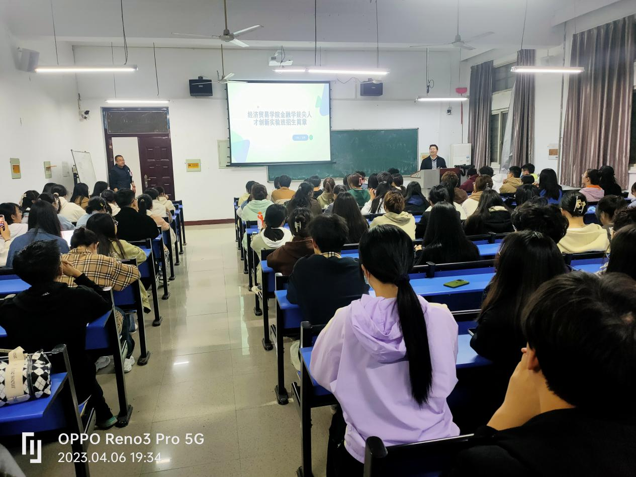 在嵩山路校区3104举行首届金融学拔尖人才创新实验班招生宣讲会,副院长朱坤林、金融学系主任奚宾进行宣讲,2022级经济学类本科生参加宣讲。