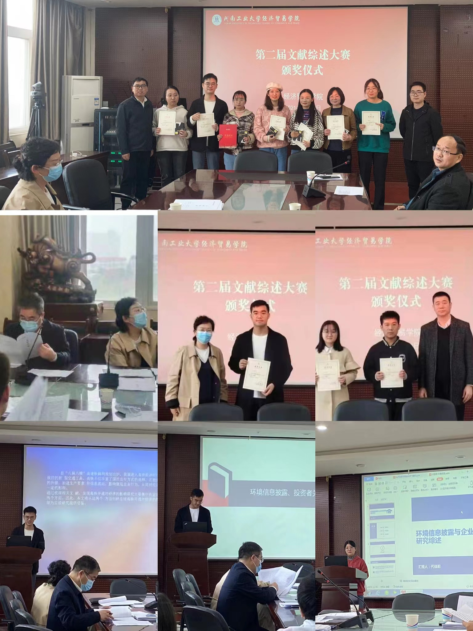 决赛答辩会上,李文启副院长首先讲解比赛规则,孙院长对学生们寄语“通过本次比赛可以让学生互相交流,也有助于完成毕业论文,希望同学们好好发挥,取得好成绩。”大赛以抽签方式决定参赛顺序,每人限时演示,分数由盲评、现场答辩和回答问题三部分构成,综合分数最高者获胜。在讲解环节,学生们在规定时间内详尽展示自己的作品,力求准确表达自己的思路和观点。综述内容涵盖粮食贸易、企业经营、科学技术等多个不同领域。各位评委老师也针对作品提出相关问题,同时指出存在的格式、数据罗列、行文逻辑等问题,帮助学生完善精进自己的论文。经过角逐,最终有8位同学胜出,一等奖一名由张威威同学收入囊中,二等奖两名得主为冯原胧、李幸同学,三等奖有6名同学,另外还有7名同学获得优秀奖。由刘扬副院长、经贸学院党委书记李刚老师等为获奖人员进行颁奖。或丰厚奖品,或老师指点,每位同学的付出都能有所收获。
