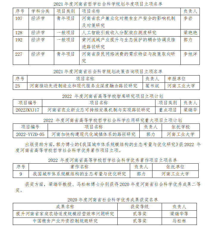 科研项目立项方面,翟书斌教授、郭力博士、李岩博士、梁艳艳博士、李旭洋博士分别获得2021年度河南省哲学社会科学规划决策咨询项目立项、年度项目立项;梁瑞华教授获得2022年度河南省高等学校智库研究项目立项;郭力博士获得2022年度河南省高等学校哲学社会科学研究重大项目立项。
