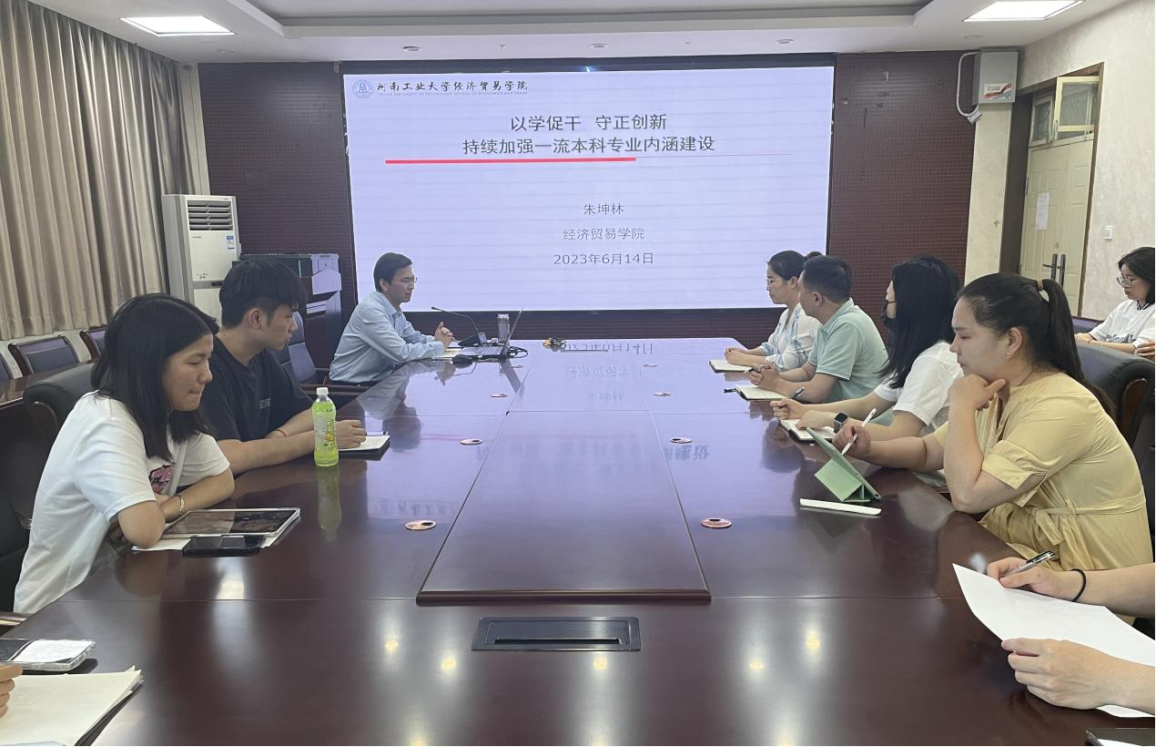 为深入开展学习贯彻习近平新时代中国特色社会主义思想主题教育,贯彻落实全国教育大会及新时代全国高校本科教育工作会议精神,6月14日下午,国际贸易系教工党支部在3501会议室召开主题教育学习活动,麻豆tv 副院长朱坤林教授应邀做题为“以学促干 守正创新 持续加强一流本科专业内涵建设”专题党课。国际贸易系部分党员、学生第五党支部全体成员参加,会议由系党支部书记鲁慧鑫主持。