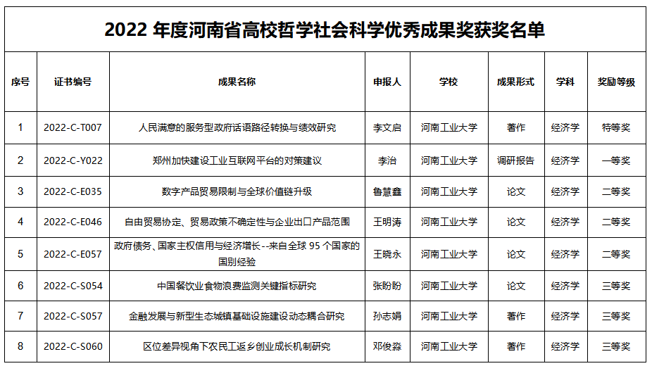 高度重视、精心组织,经初审推荐的8项作品全部获奖,研究领域广泛,覆盖政治经济学、产业经济学、国际贸易学、金融学、区域经济学等;成果形式多样,涵盖著作、调研报告、论文等。