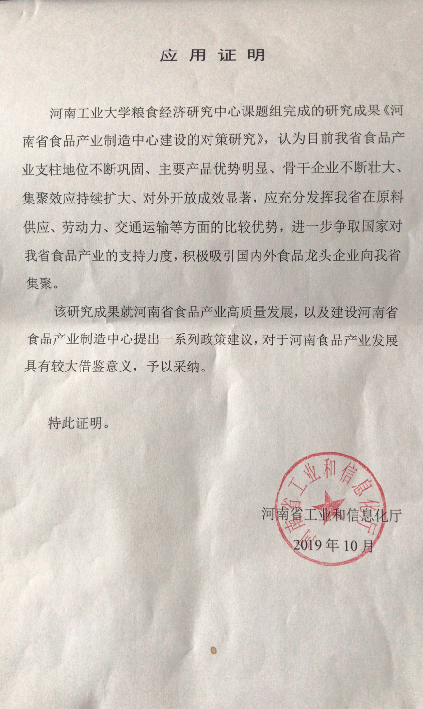 应用证明——河南省食品产业制造中心建设的对策研究