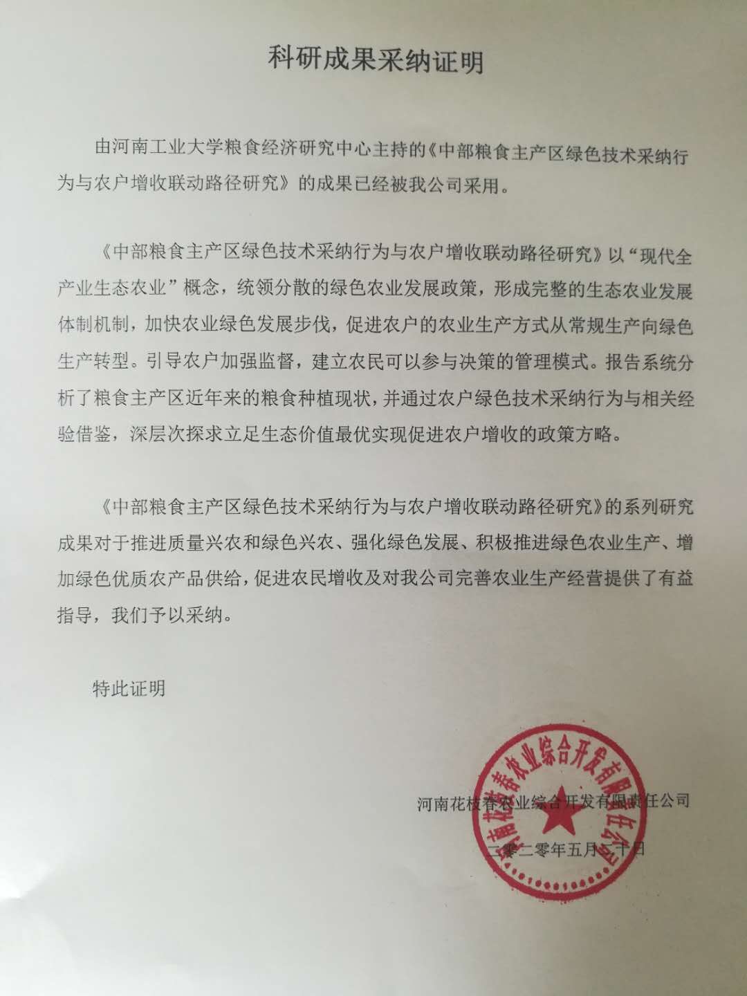 科技成果采纳证明——中部粮食主产区绿色技术采纳行为与农户增收联动路径研究